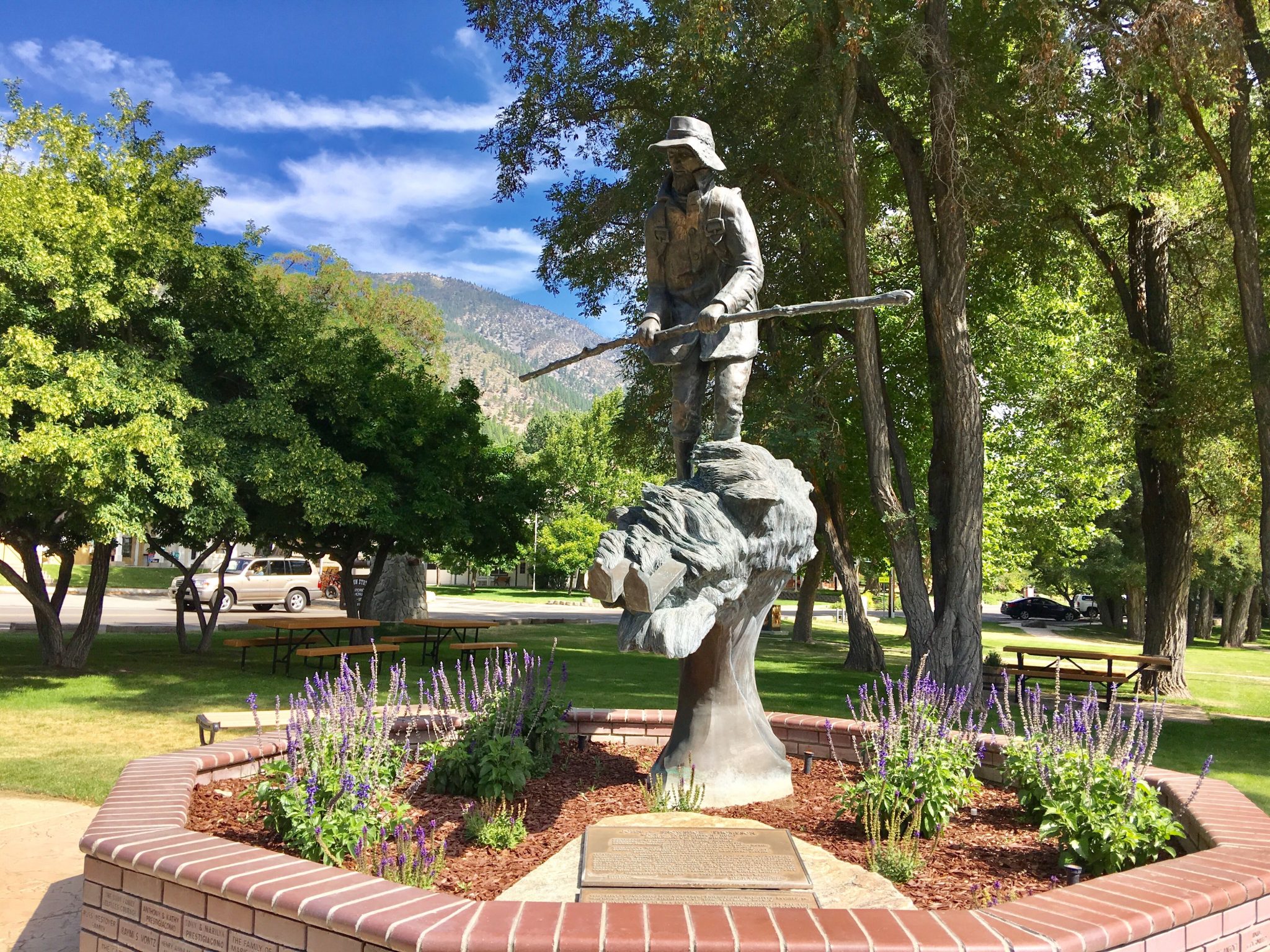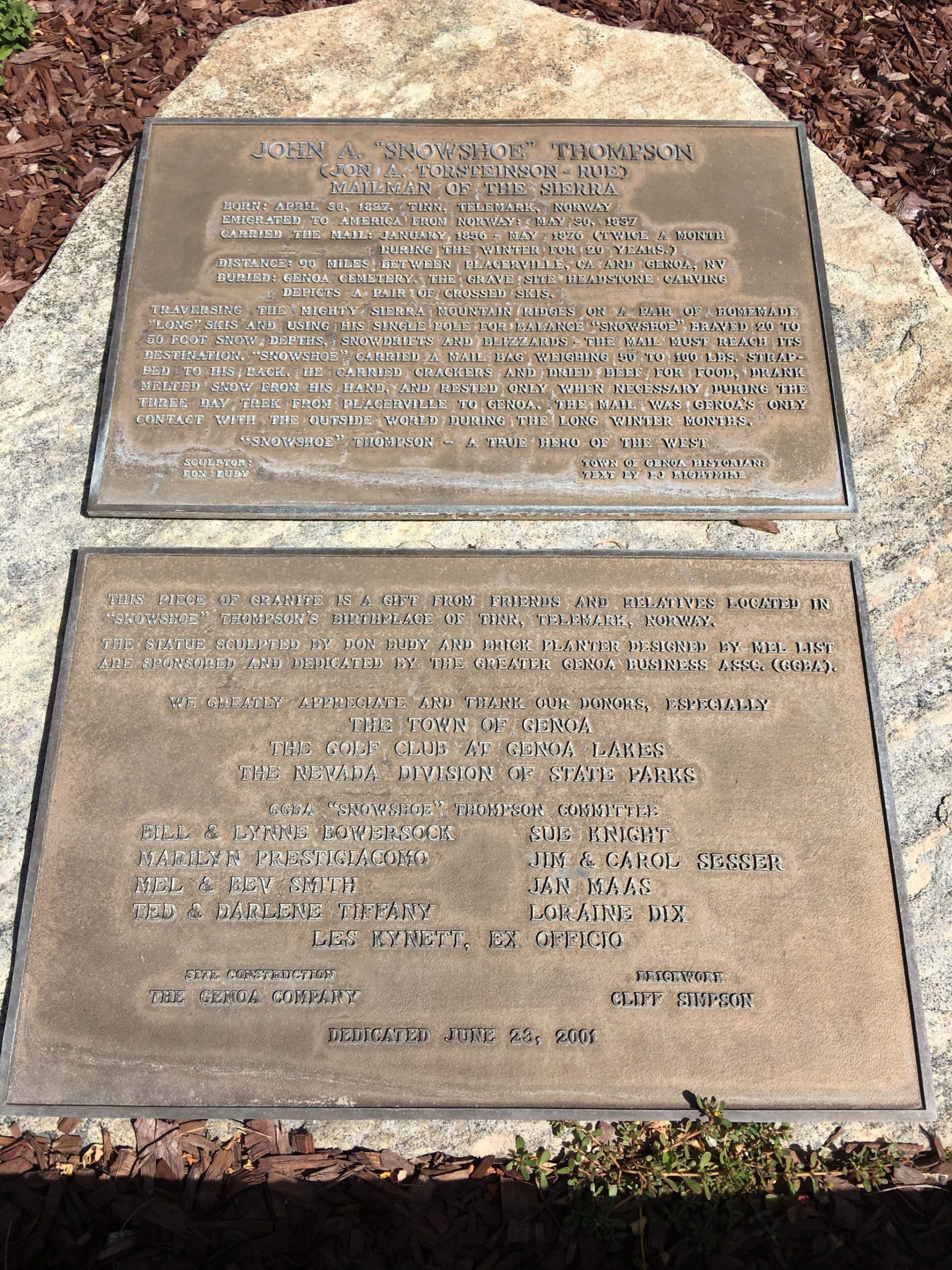 Genoa Country Innの真ん前にある緑豊かな州立史跡公園。ネバダ州とカリフォルニア州をつなぐ街道に金鉱等の交易所として1851年に建てられたのがモルモン・ステーション。園内は緑豊かで木陰のある散歩道があり、当時使われた馬車や農耕具などが展示されているスポットもあります。銅像は ジュノアの英雄、ジョン・”スノーシュー”・トンプソン。1856年~1876年の20年間、カリフォルニア州のプレイサーヴィルとジュノア間の郵便配達を無償で行い、冬の豪雪期間もスキー(あだ名はスノーシューだが、実際にはスキーを使用)を履いて配達をこなした凄い人です。