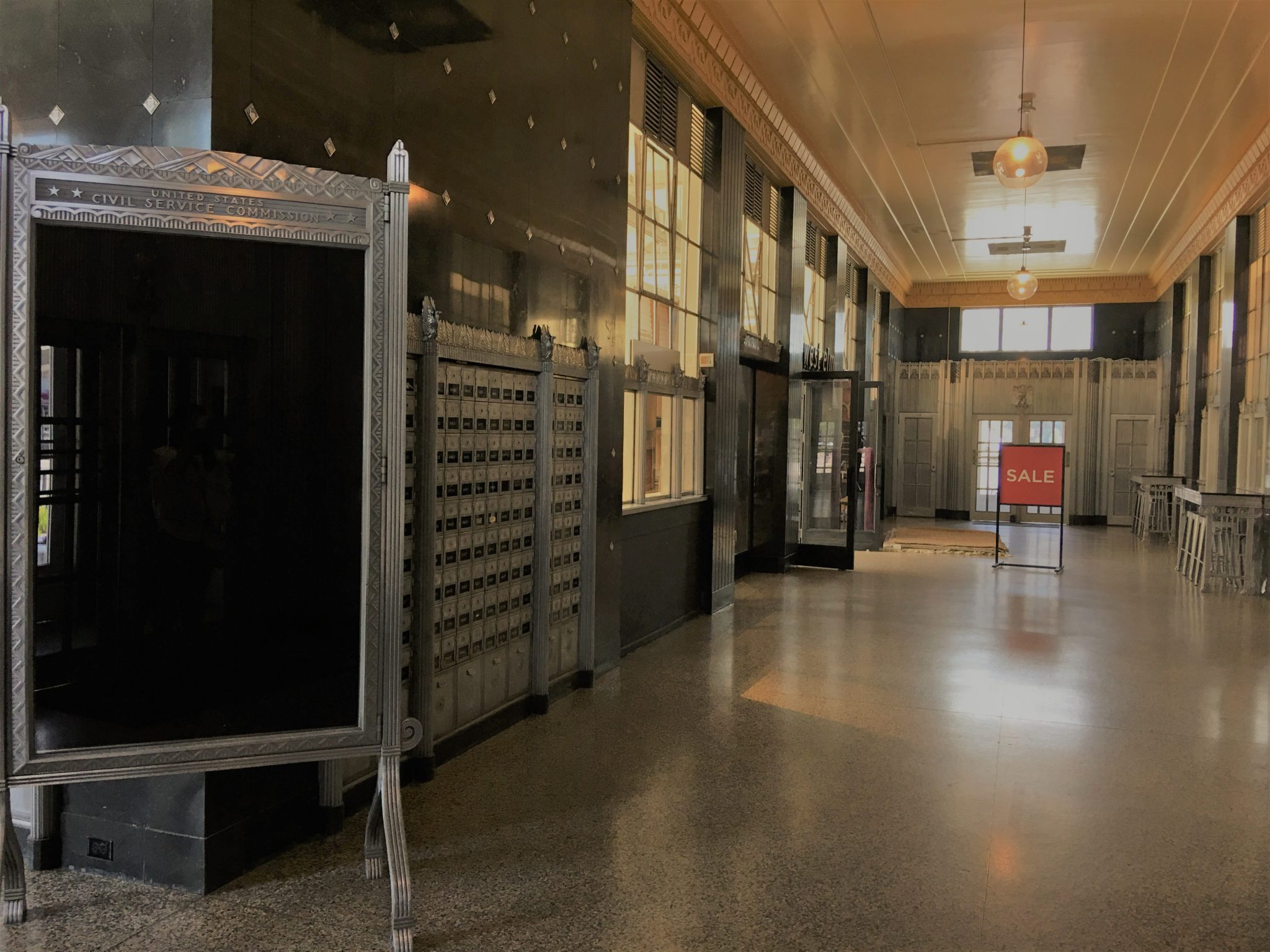 かつての私書箱が残されています。こちらもアルミニウム製。鷲のモチーフがここでも見られます。これらは、自由に見ることができるスペースとなっています。