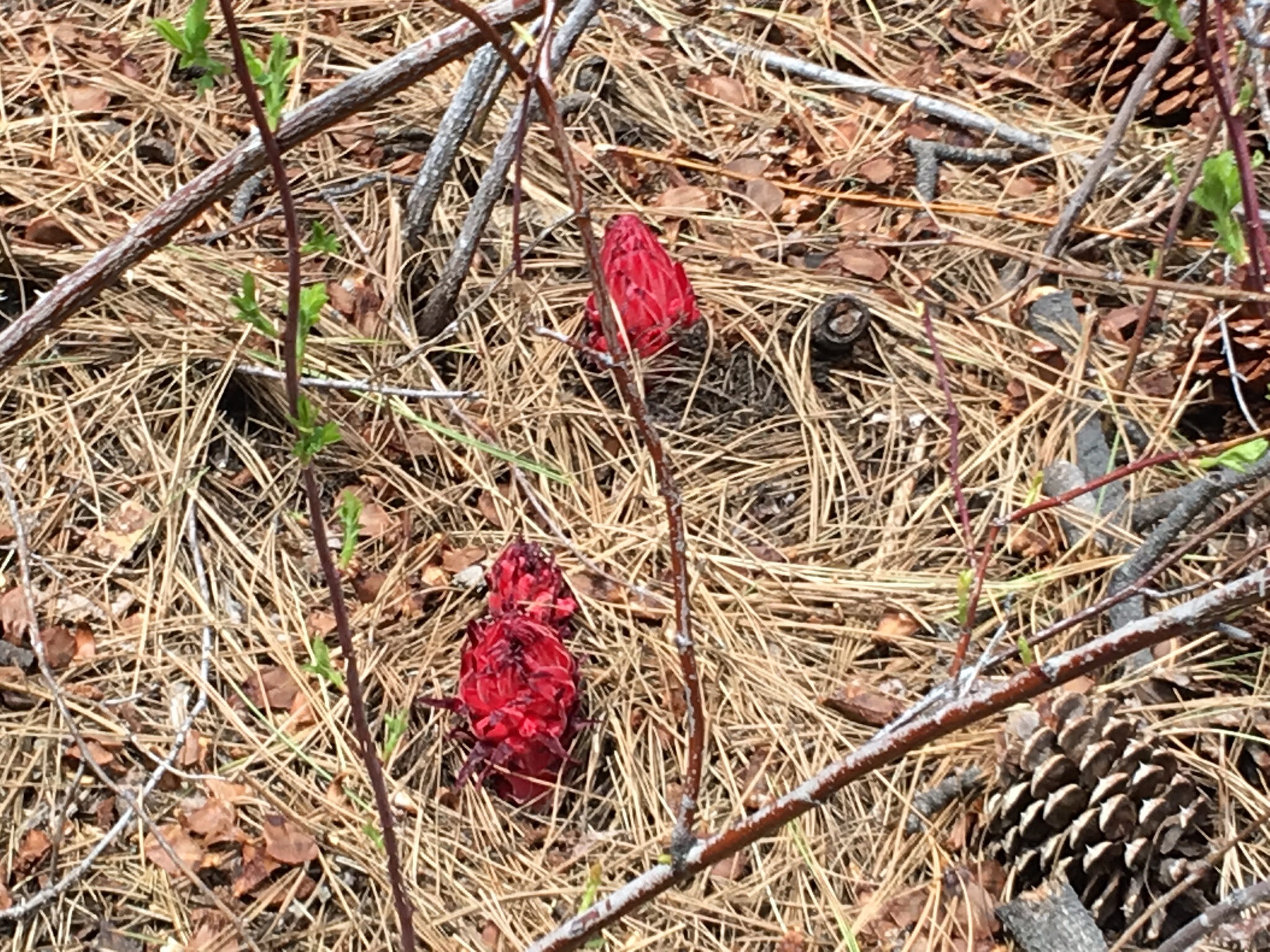 鮮やかな深紅でユニークな形状・生態のスノープラント(正式名:Sarcodes)はシエラネバダとカリフォルニア州の山間で主に4月下旬から初夏(積雪量や標高等により開花時期は異なる)にかけて見られます。