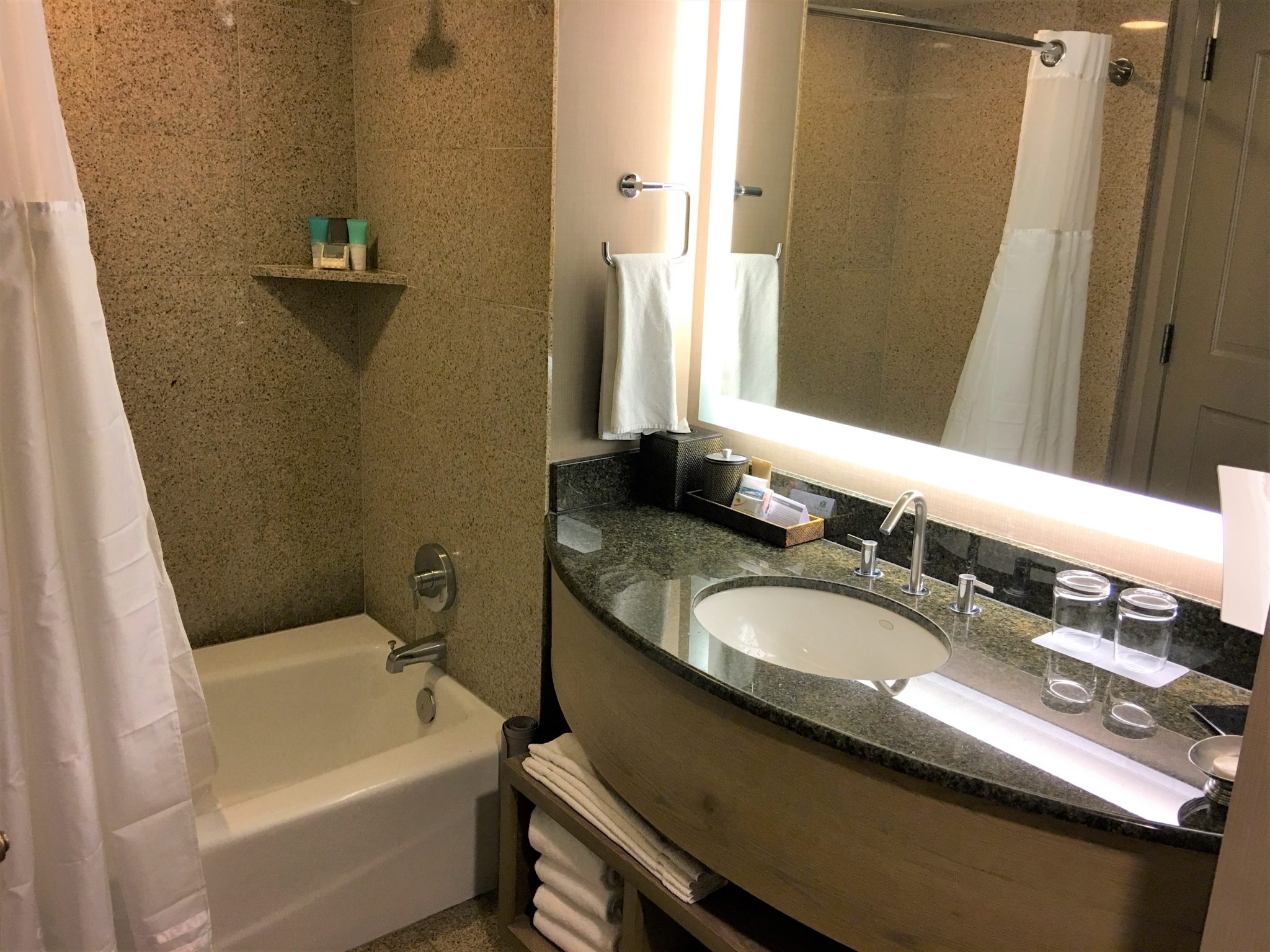 ロッジ風なホテル・ロビーで3匹の可愛い親子熊がお出迎えをしてくれます。チェックイン時にウエルカム・シャンペンをフロントで受取り部屋へ。ちなみに1室1泊につき自動課金となるリゾートフィー($36+税 2018年10月時点) にはこのウエルカム・シャンペン、フィットネスジム利用、スキー具やゴルフバッグの保管、市内電話通話料、ビジネスセンター利用、Fax送受信利用、が含まれてます。利用してもしなくても課金されますので利用しないと損ですね。