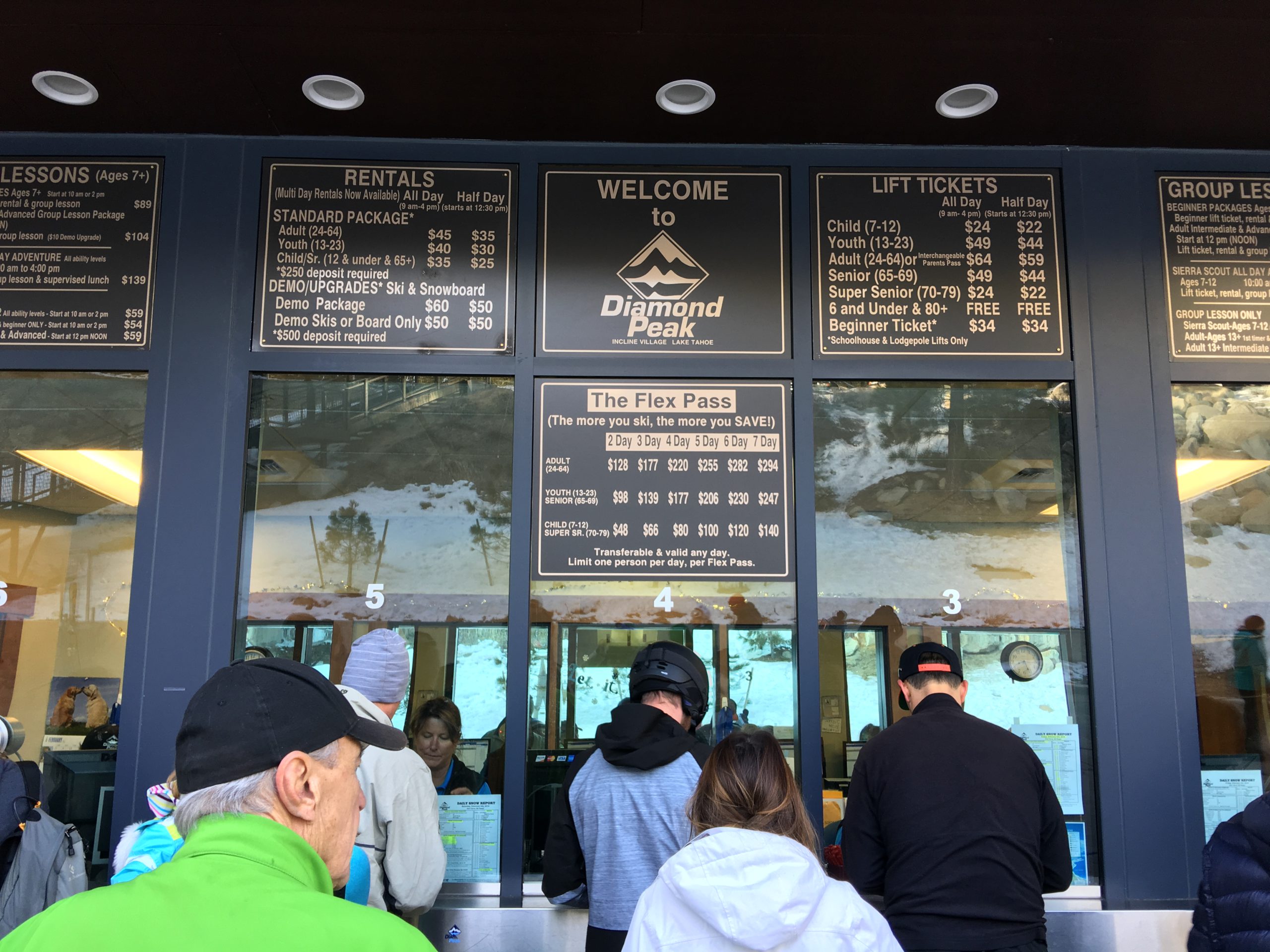 駐車もすんなり出来、まずはチケット売り場でリフト券購入。レンタルやレッスンもここでぜーんぶ払っちゃいます。Yelpで予習をしたところ、朝一に来ないと駐車場の台数が少なくて駐車に困ったりチケット売り場で長蛇の列に並んだりと難儀したという声が多かったので頑張って8時過ぎ(チケット売り場は8時オープン、リフトは9時オープン)に到着して大正解。