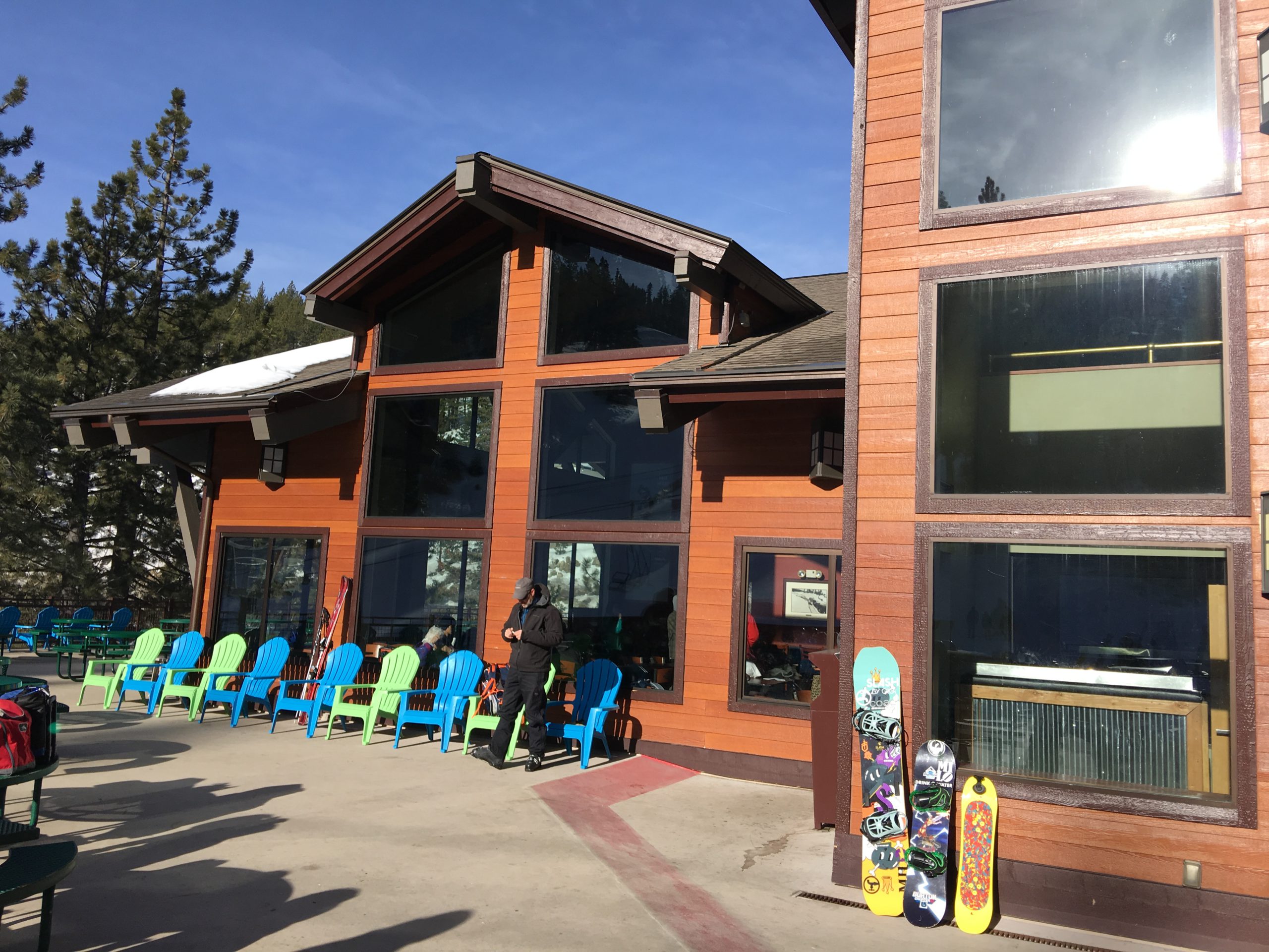 山の中腹裾にあるこのSnowflake Lodgeはこちらもロッジといっても宿泊施設ではなくカフェテリア兼休憩所でここからの眺望はそれはそれは素晴らしい紺碧のタホ湖ビュー!スキーはともかく、この景色を見にだけにでも来たいとおもわせるレイクビューです。ここは朝はガラガラでしたがランチ時分は食事の購買は長蛇の列&テーブルは争奪戦、とかなり混む激戦区となります。週末はここでBBQランチも販売してます。