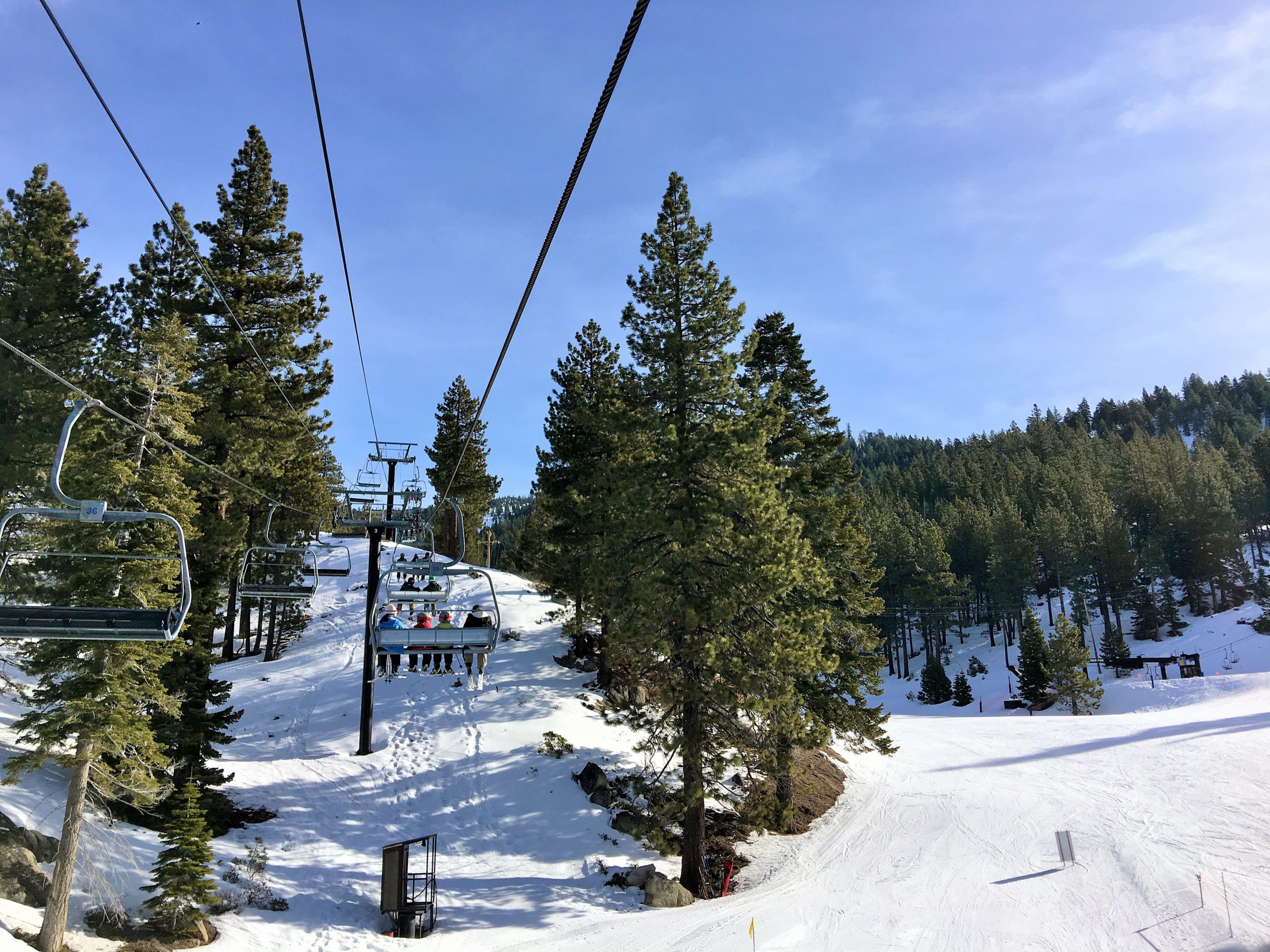 Snowflake Lodgeを出て中級コースのRidge Run~初級コースのFreewayを経てCrystal Expressリフトで山頂へ。さすが山頂、タホ湖ビューはさらに美しさがパワーアップされた息を呑む眺望でしばしうっとりと眺めを堪能。ず~っと眺めていても飽きなかったですが、湖を眺めながらのスキーもしないと!なのでCrystal Ridge方面へ。