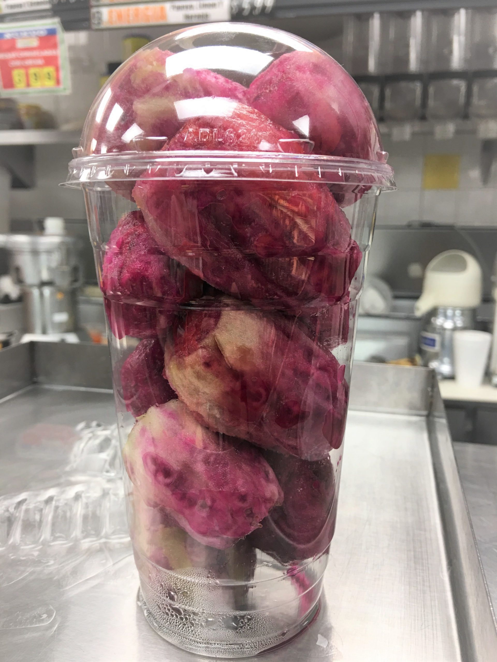 あと、Jugos ジュース、Licuados スムージー、Raspados かき氷、季節のフルーツカップも。写真のカップはドラゴンフルーツ。
